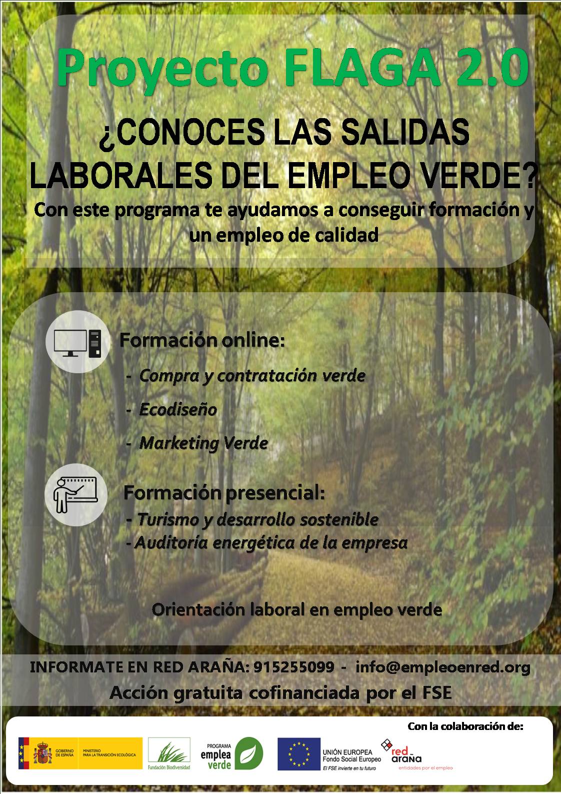 El objetivo de Flaga 2.0 es facilitar un puesto de trabajo a personas desempleadas en empresas de los sectores generadores de empleo verde. Esta inserción la lograremos a través de la formación de nuestros usuarios en cursos relacionados con la economía verde, tanto en formato presencial como en formato online. Esta formación servirá para tener unos conocimientos que les permitan tener más facilidades a la hora de encontrar un empleo verde. Así mismo el proyecto sirve para empoderar y mejorar las capacidades de personas que se encuentran en situación de desempleo y han visto en la economía Verde una oportunidad de inserción laboral.