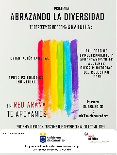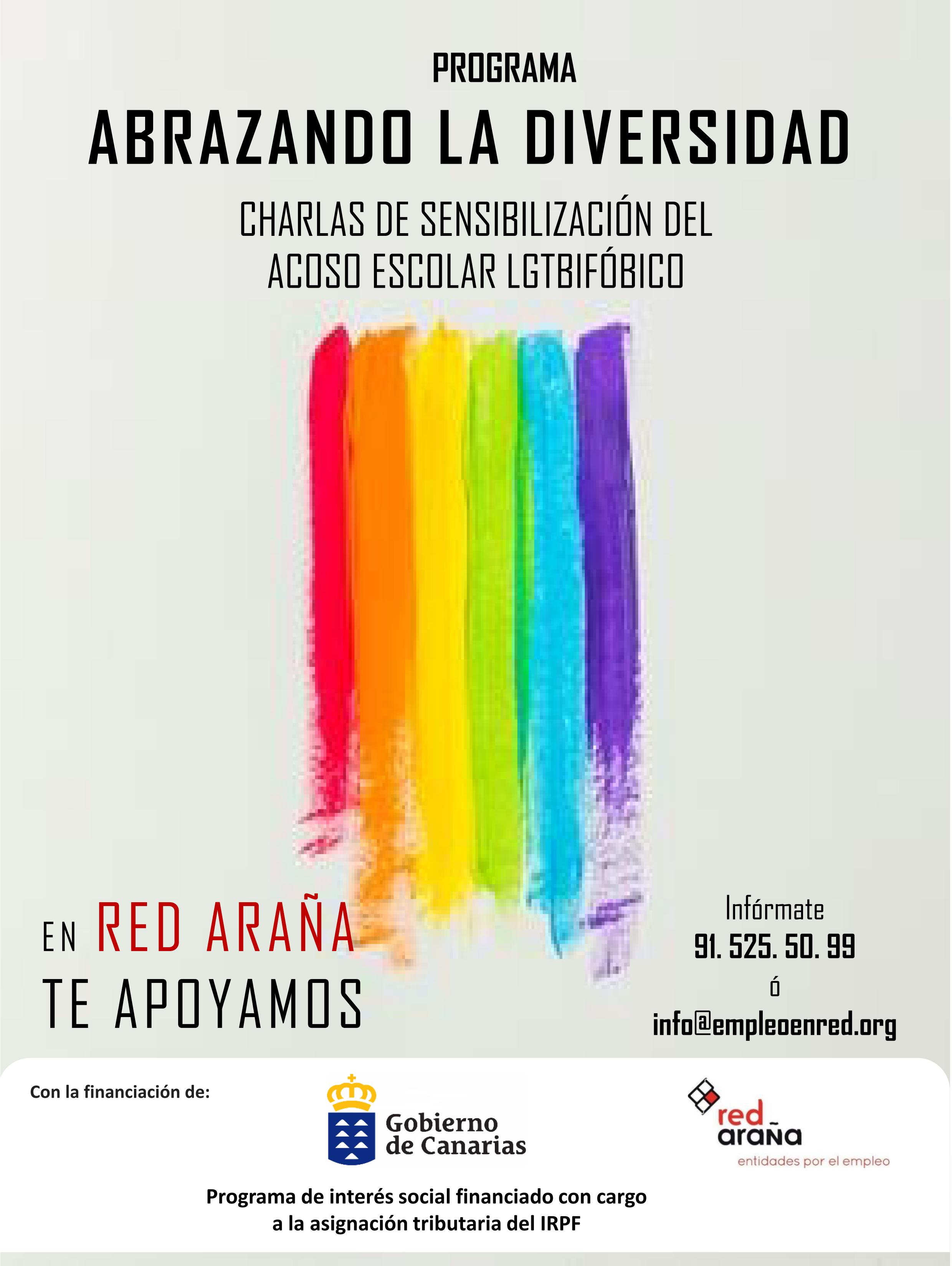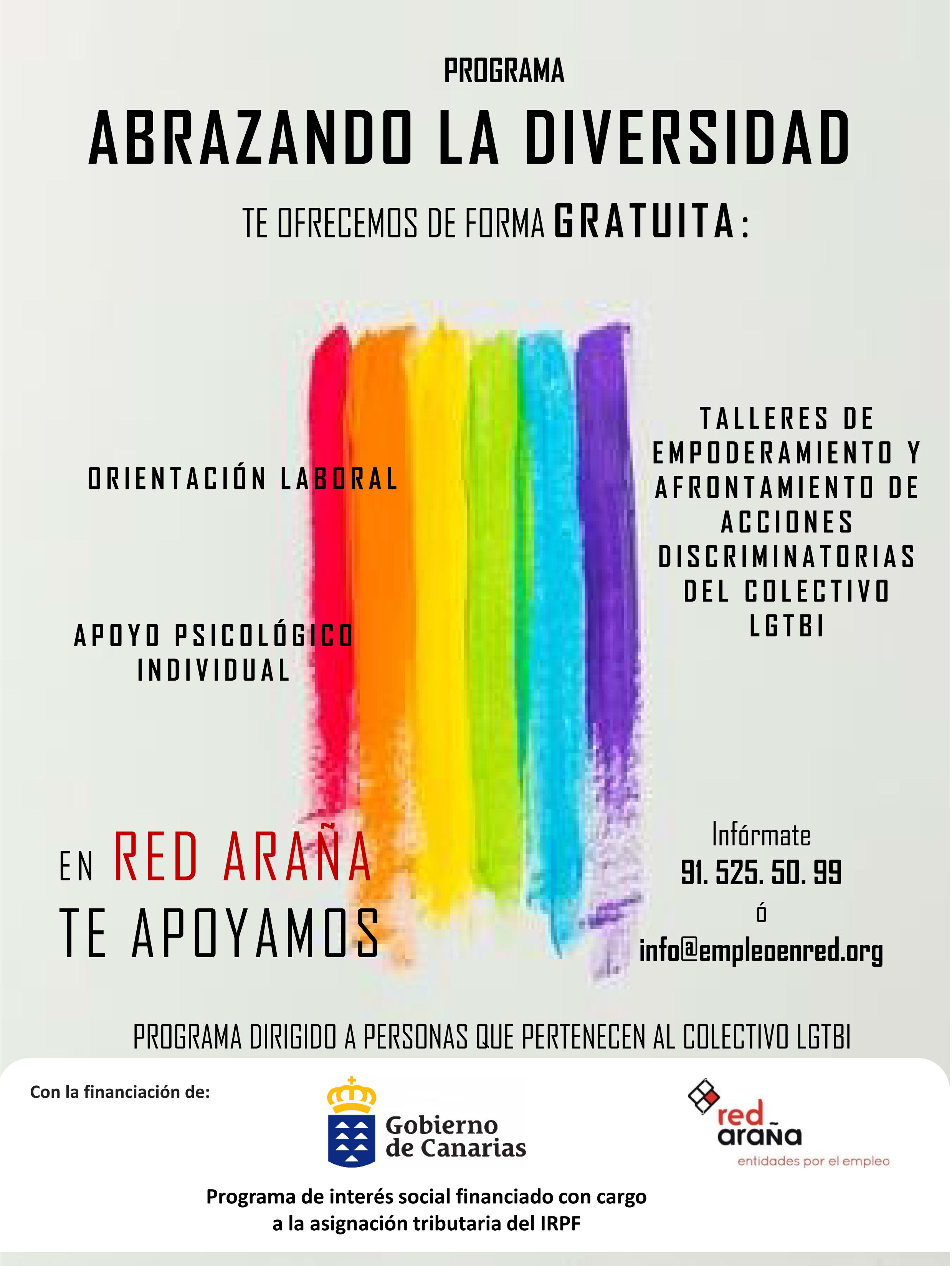 Abrazando la Diversidad es un proyecto con un doble objetivo. Por un lado se enfoca a realizar talleres sensibilización a jóvenes en acoso escolar Lgtbifóbico, y por otro, está diridigo a personas pertenecientes al colectivo LGTBI, para mejorar su salud mental, mediante acciones de fomento de la autoestima, el apoyo psicológico y la inserción laboral.