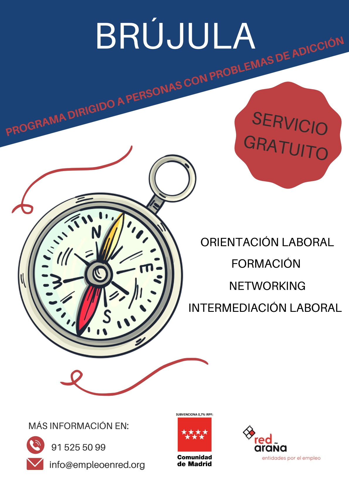 El programa Brújula es un servicio gratuito que se lleva a cabo en la Comunidad de Madrid. Está dirigido a personas con problemas de adicciones con el objetivo de conseguir mejorar la empleabilidad y la ocupabilidad de nuestr@s participantes, facilitando los recursos, herramientas y metodologías para conseguirlo.