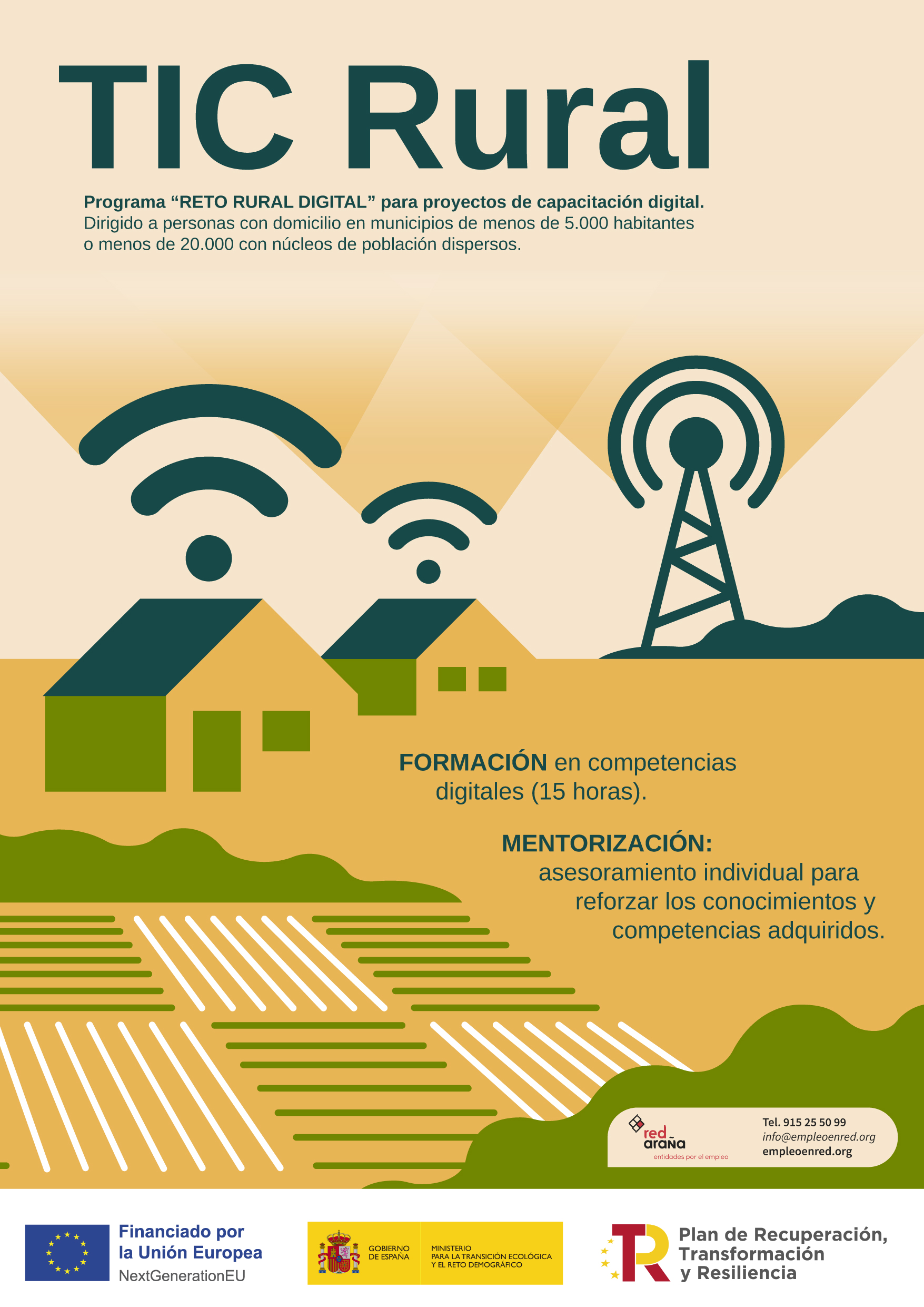 TIC Rural se integra en el programa "Reto Rural Digital" para proyectos de capacitación digital en el marco del Plan de Recuperación, Transformación y Resiliencia. Está dirigido a personas con domicilio en municipios de menos de 5.000 habitantes o menos de 20.000 con núcleos de población dispersos, e incluye: